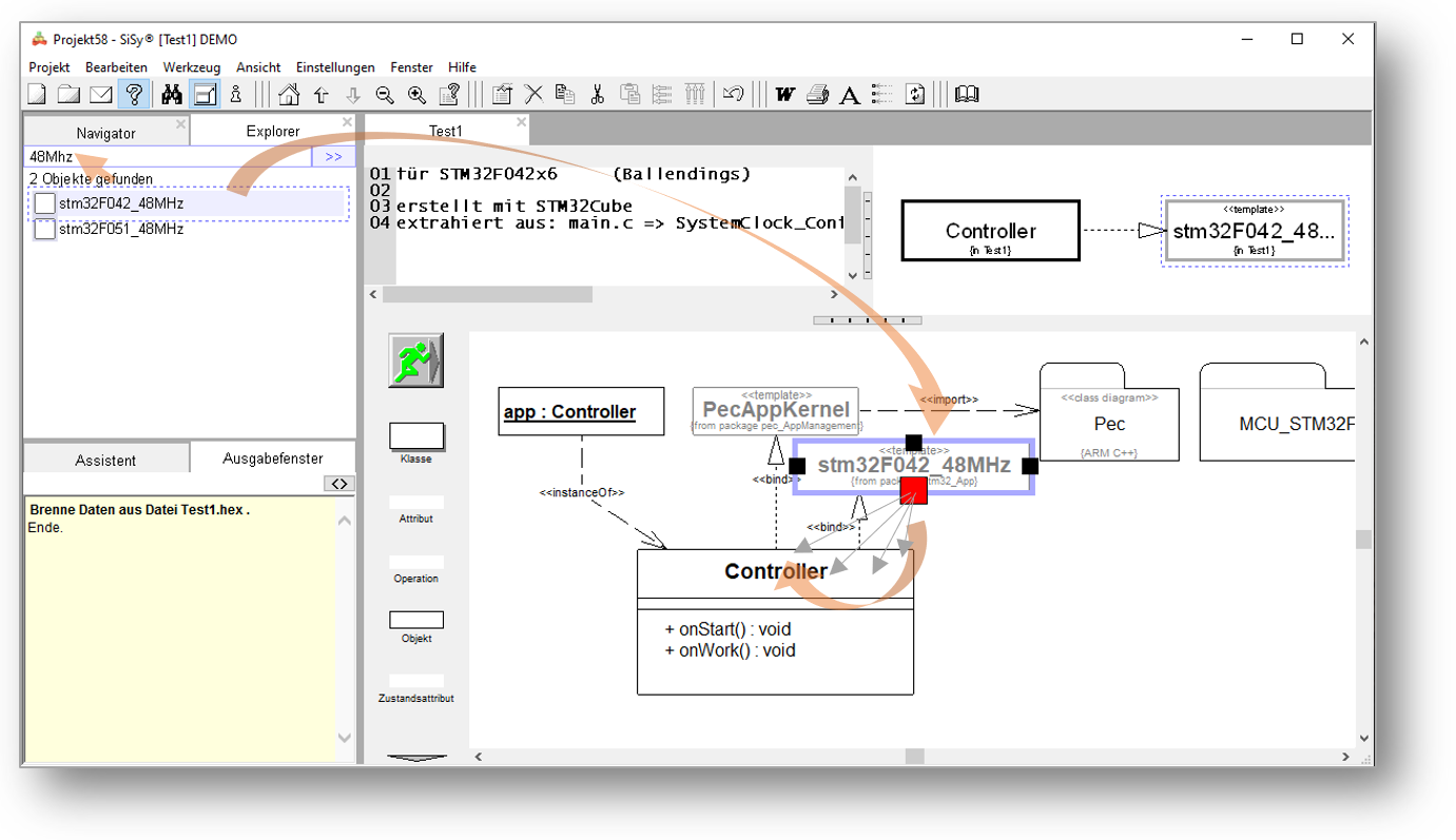 So wie die Anwendung jetzt vor uns liegt tut das Programm nichts, sondern läuft im Leerlauf. Trotzdem wollen wir aus dem Klassendiagramm den Quellcode generieren, diesen übersetzen und auf den Controller übertragen. Das erfolgt über das Aktionsmenü in der Objektbibliothek. Wählen Sie dort den Menüpunkt Erstellen, Brennen Ausführen.