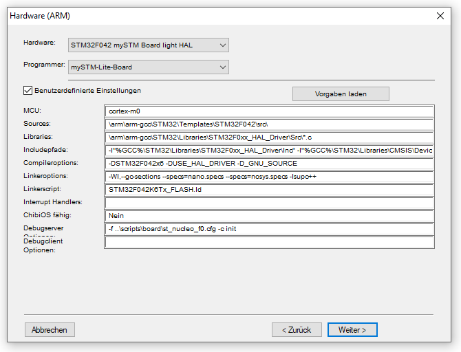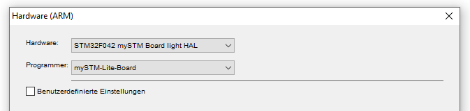 Wählen Sie im nächsten Fenster die Hardware STM32F042 mySTM32 Board light HAL und den Programmer mySTM-Light-Board aus.
