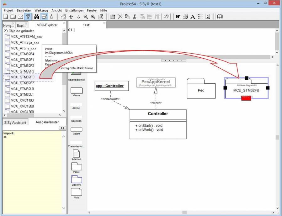 Weisen Sie dem Diagramm das Treiberpaket für den konkreten Controller MCU_STM32F0 zu. Sie finden dieses Paket über den Navigator (UML-Pakete) oder über die Suchfunktion im Explorer.