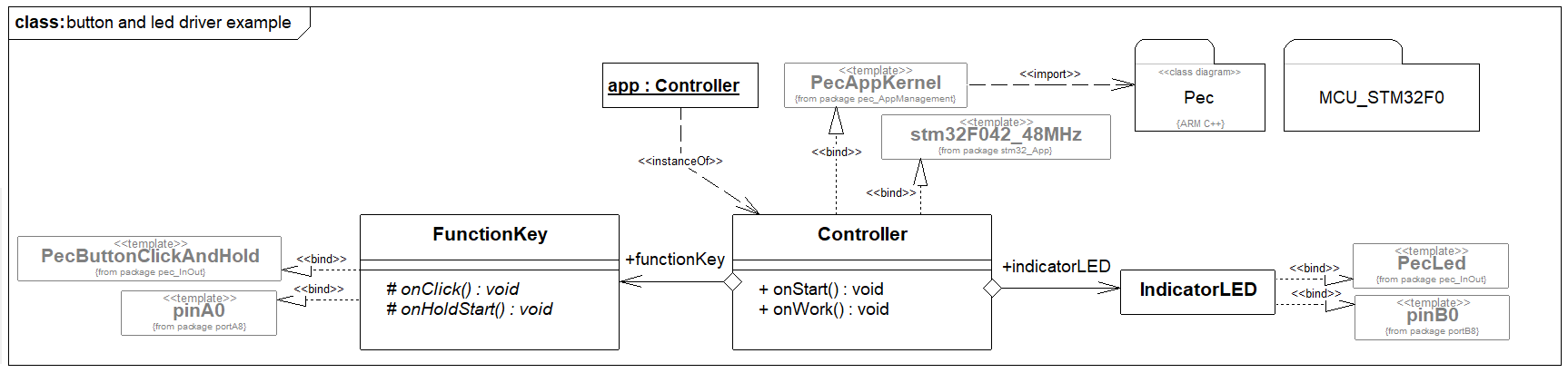 - Bibliotheksbaustein PecLED in das Diagramm ziehen und mit der der Klasse IndicatorLED verbinden