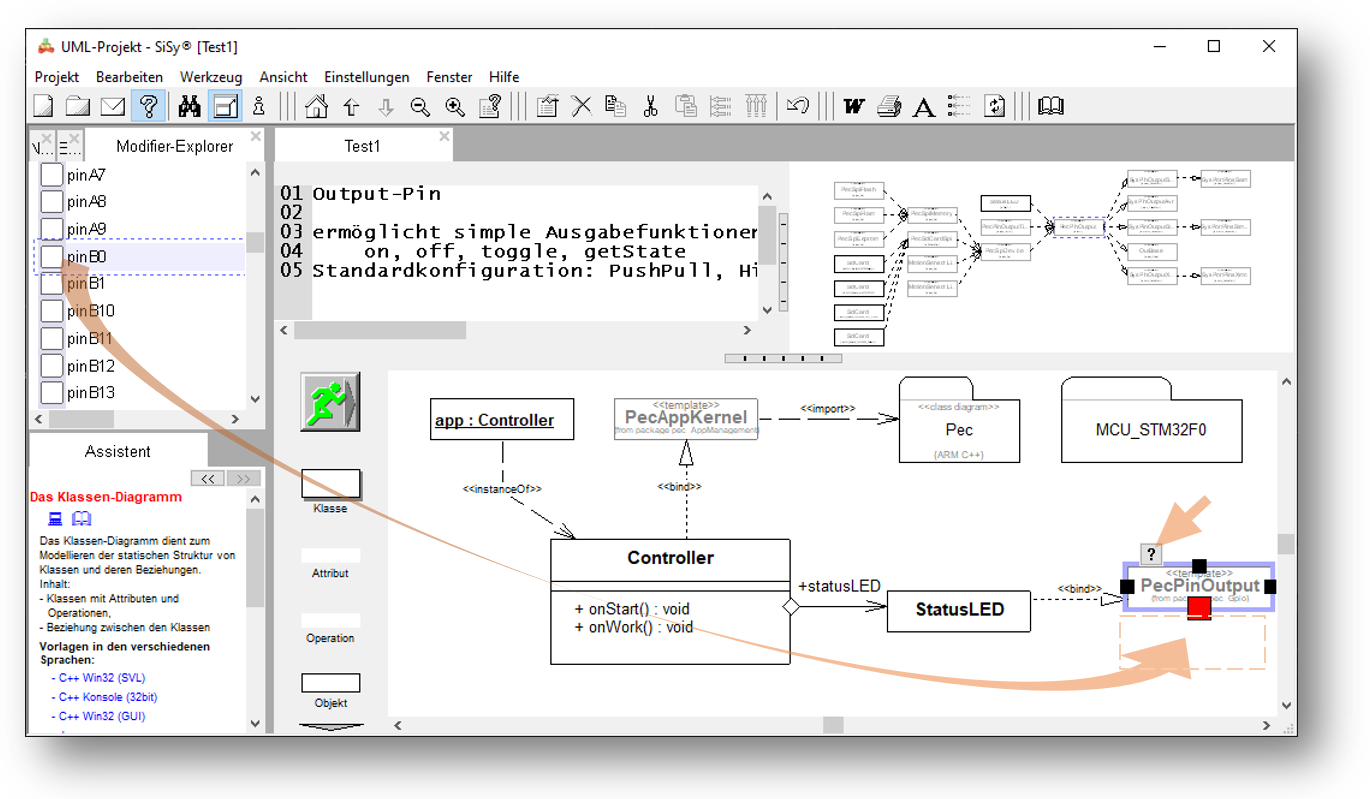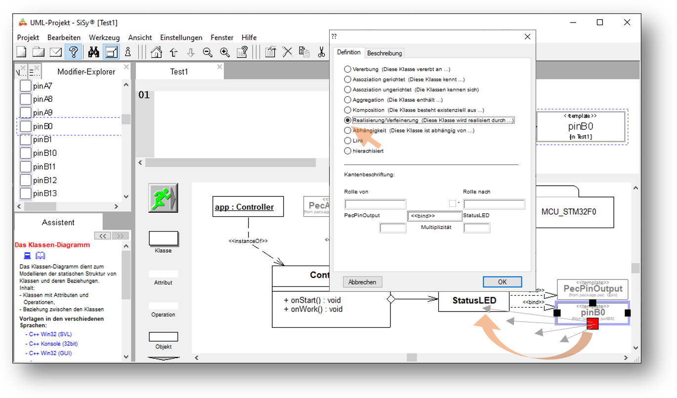 Verbinden Sie den Baustein pinB0 mit der Klasse StatusLED. Wählen Sie als Verbindungstyp die Realisierung.