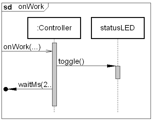 Die eigentliche Verhaltenslogik für das Blinken der LED notieren wir als C + + Code in der Operation onWork() der Klasse Controller. Um die LED blinken zu lassen schalten wir die LED zyklisch um (togglen). Damit das Auge dieses toggeln auch wahrnimmt bauen wir eine kleine Pause ein. Die Möglichkeiten die der Bibliotheksbaustein PecPinOutput bietet sehen Sie rechst angezeigt. Notieren Sie den folgenden Code in der Operation onWork: