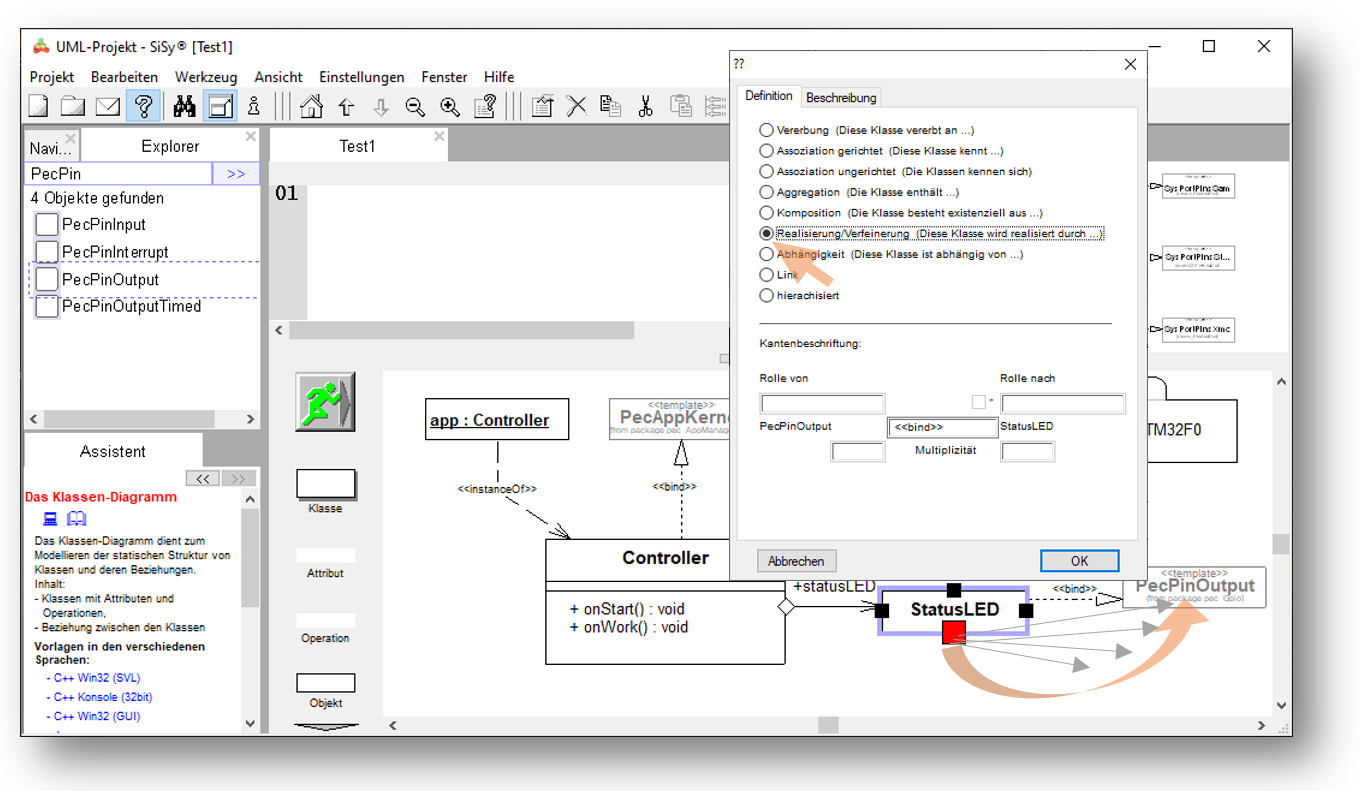 Verbinden Sie den Bibliotheksbaustein PecPinOutput mit der Klasse StatusLED. Wählen sie als Verbindungstyp die Realisierung.