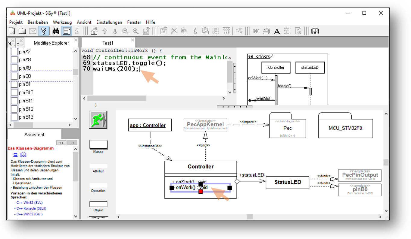 Verbinden Sie den Baustein pinB0 mit der Klasse StatusLED. Wählen Sie als Verbindungstyp die Realisierung.