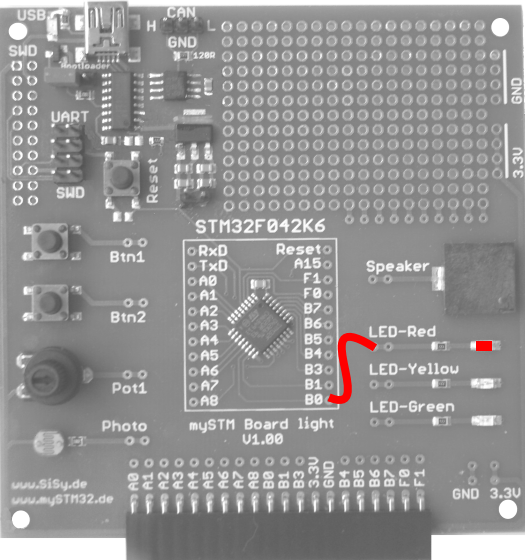 - verbinden Sie Pin B0 mit der roten LED